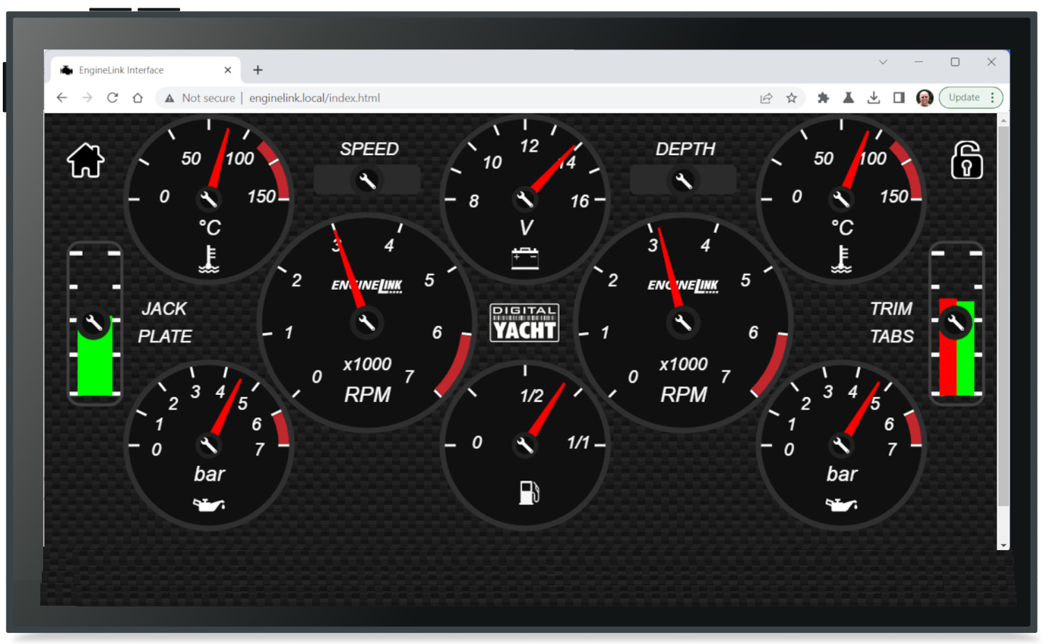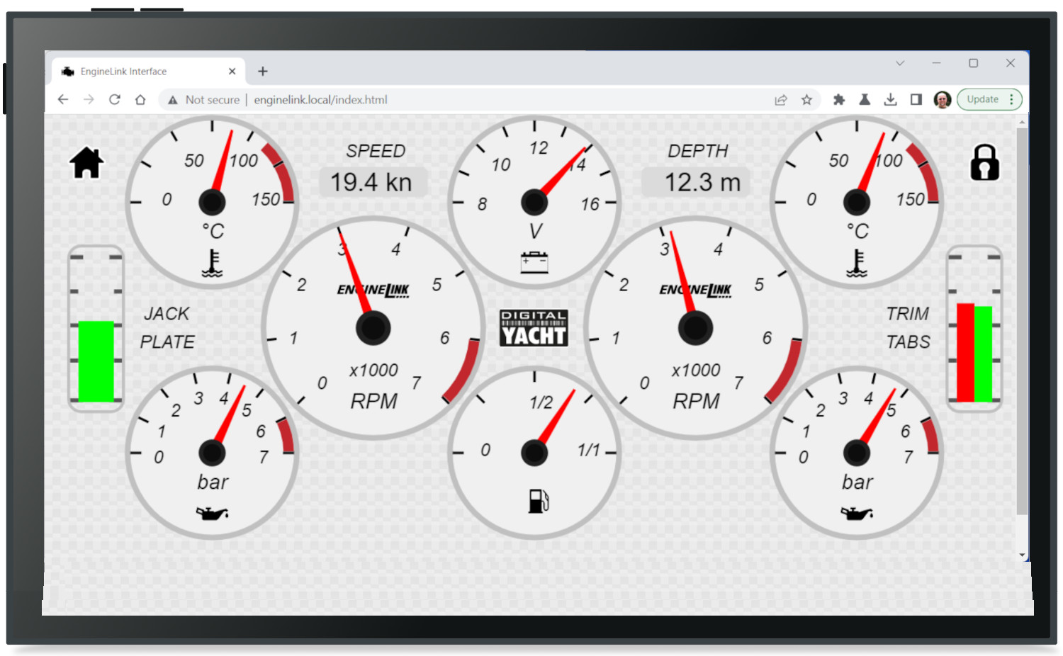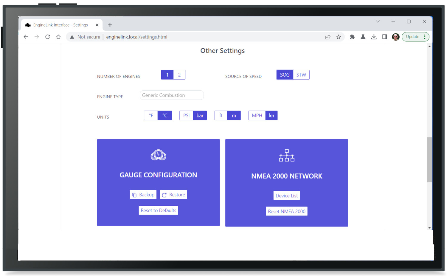 Engine information such as RPM, temperature, pressure and battery voltage are displayed as an attractive dashboard display through the web browser on the mobile device so there’s no need for a custom app. iOS and Android devices can display app data and a web browser page side by side so you can have your favourite charting app open alongside engine instrument displays.