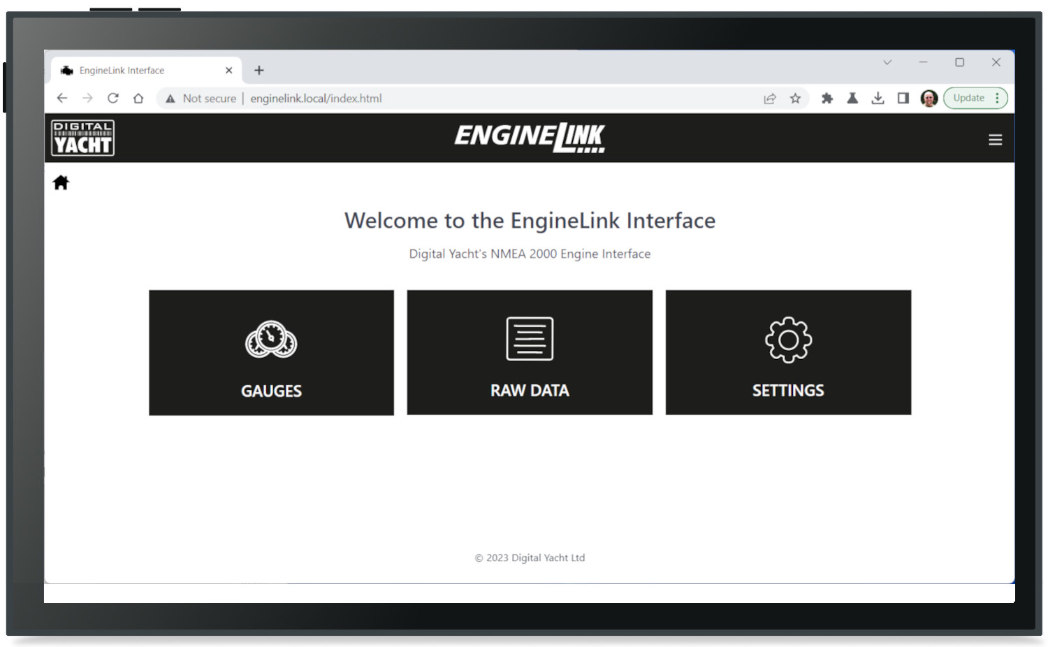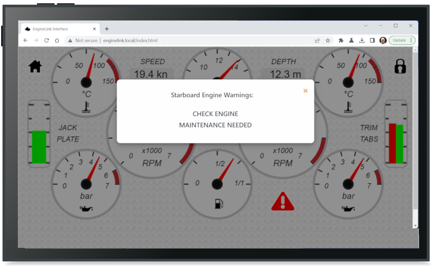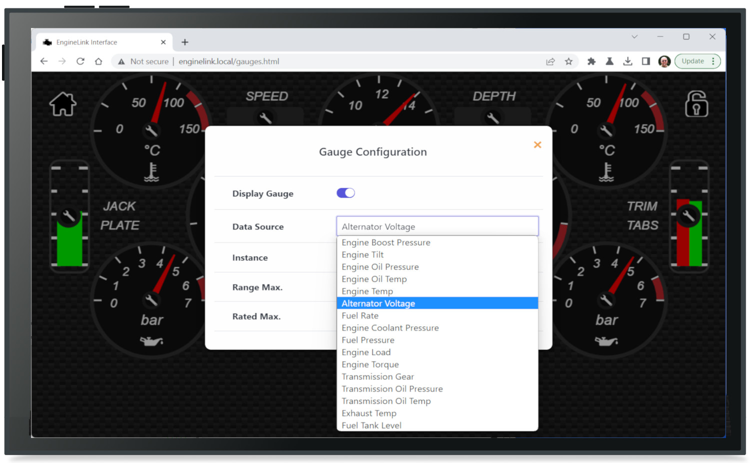 Engine information such as RPM, temperature, pressure and battery voltage are displayed as an attractive dashboard display through the web browser on the mobile device so there’s no need for a custom app. iOS and Android devices can display app data and a web browser page side by side so you can have your favourite charting app open alongside engine instrument displays.